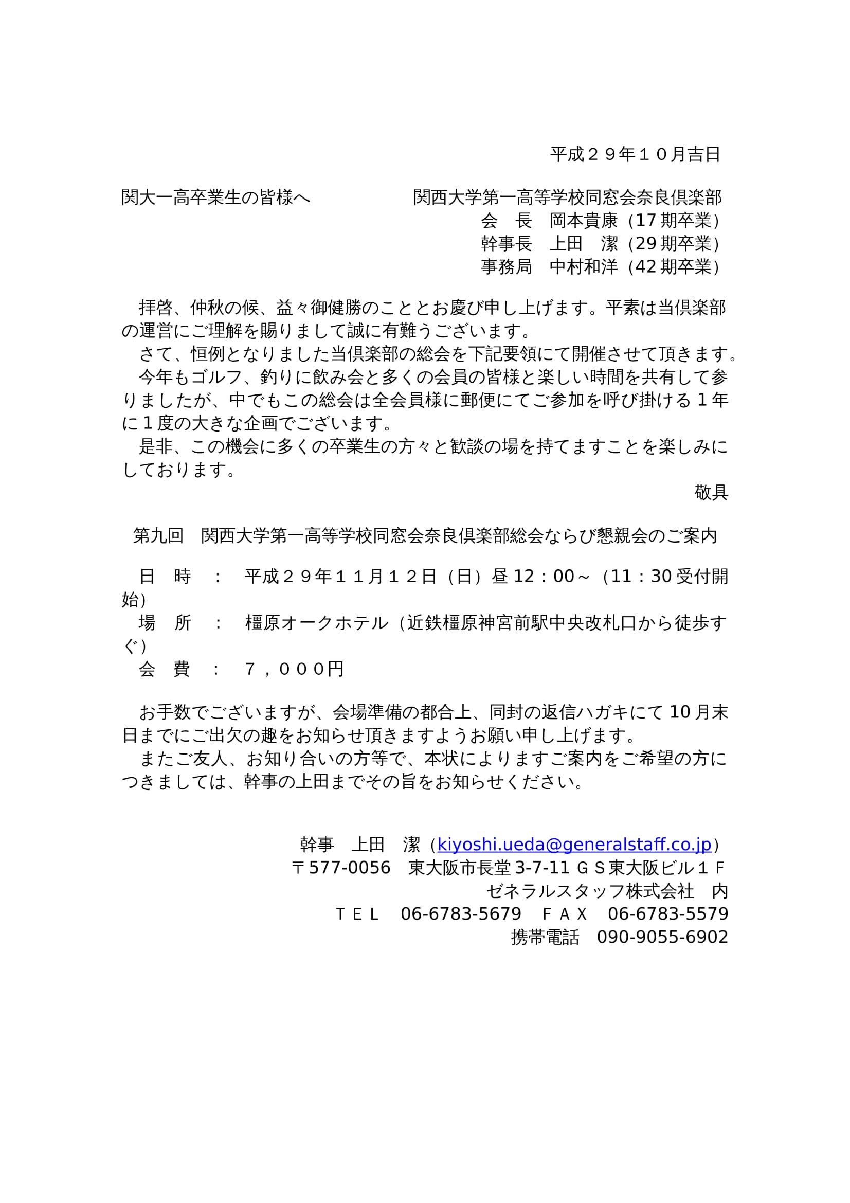 第9回 関大一高同窓会 奈良倶楽部総会ならびに懇親会がの以下の日程で行われます。